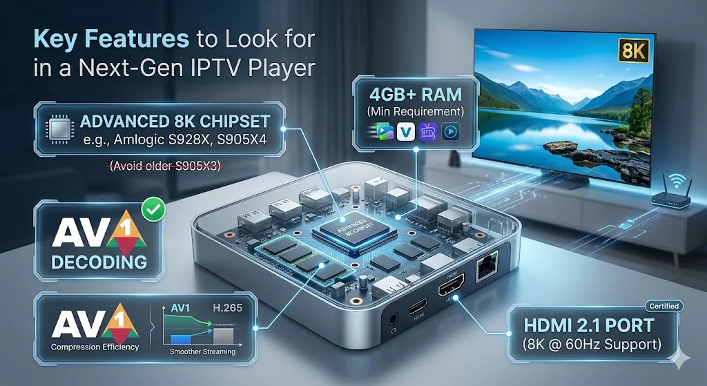 Your chosen 8k iptv box for streaming must support AV1 hardware decoding. AV1 is the new standard for high-definition streaming, offering better compression than H.265, meaning you get a better picture using less internet bandwidth. Additionally, verify that the 8k iptv box for streaming has a certified HDMI 2.1 port. Older HDMI 2.0 ports physically cannot carry the data required for 8K resolution at smooth frame rates.